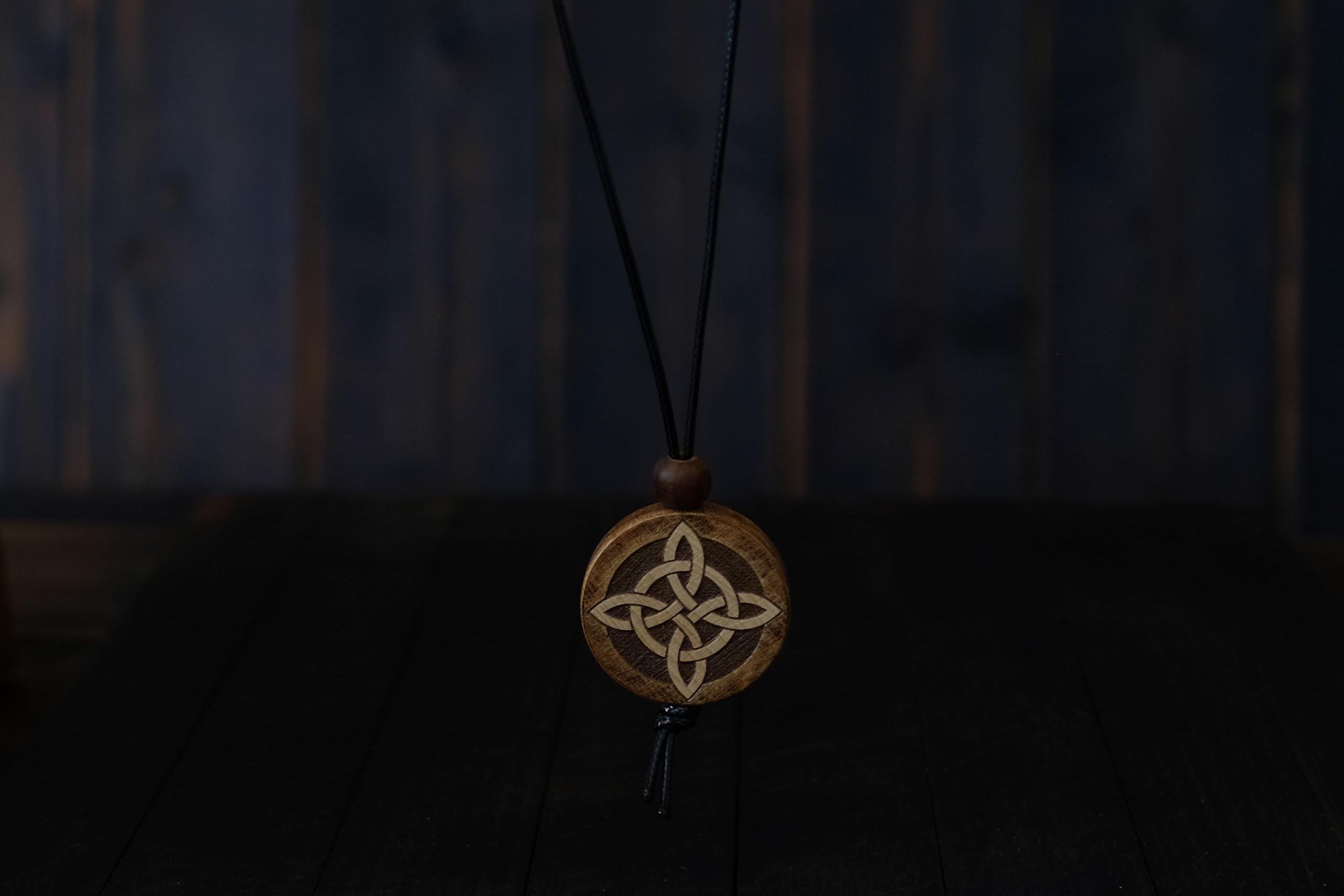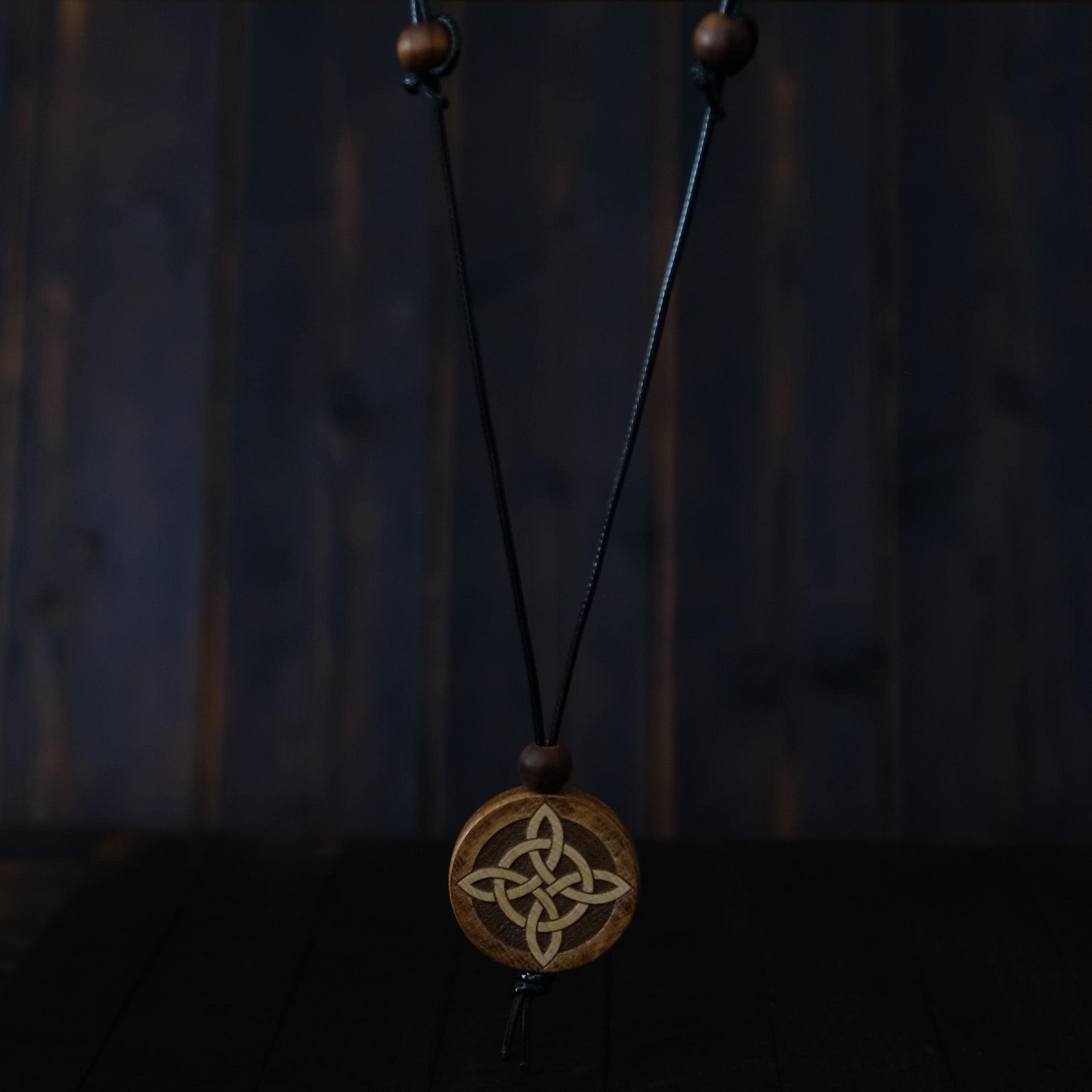 Wooden Necklace-Celtic Endless Knot-Infinite Spirit Unity Symbol. Made From Solid Wood Pendant Talisman. Round shape. Brown colour.